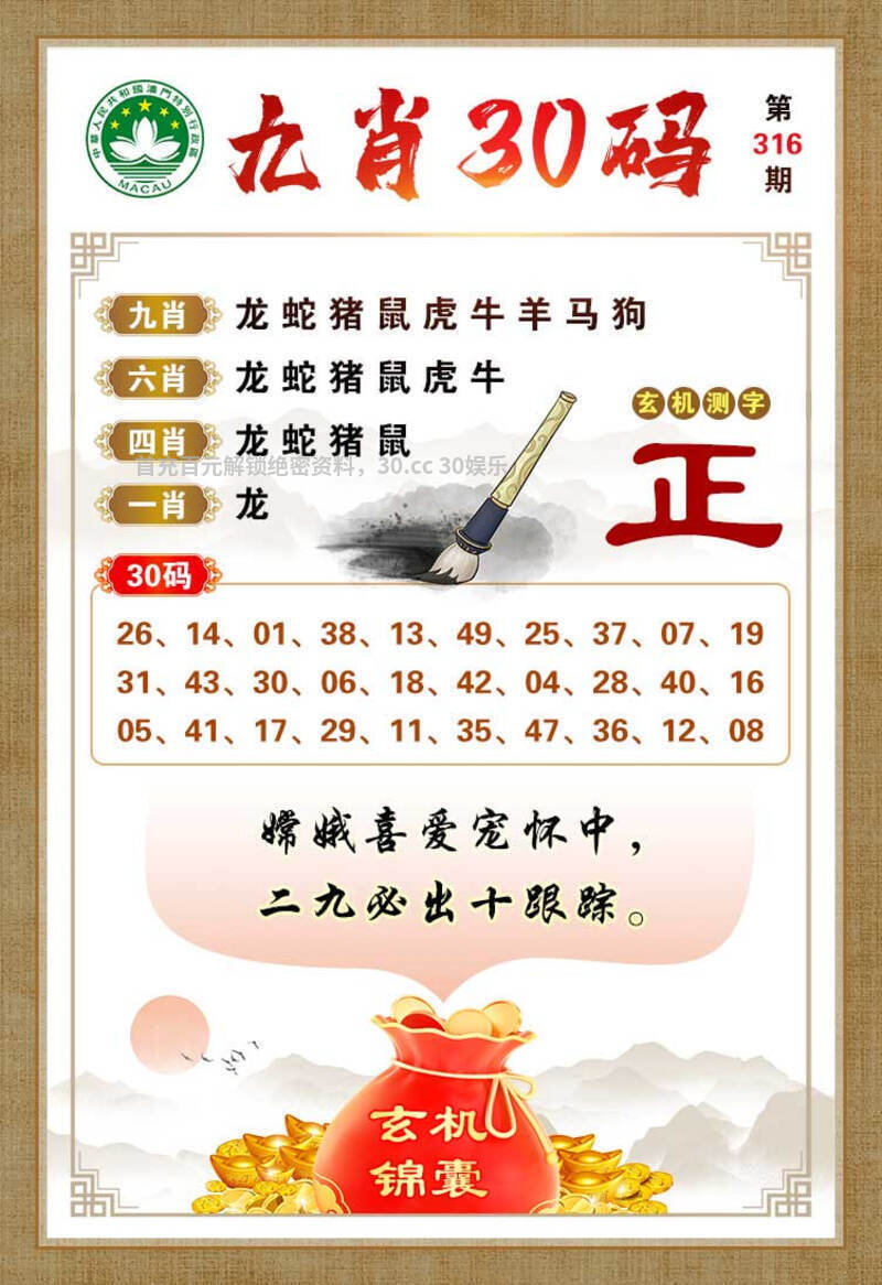 | 316期:九肖 | 猴蛇牛虎龙羊狗兔马 | 開:马24 |